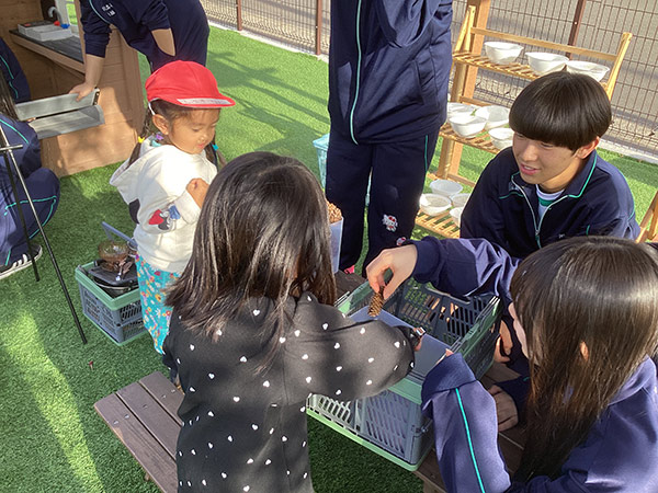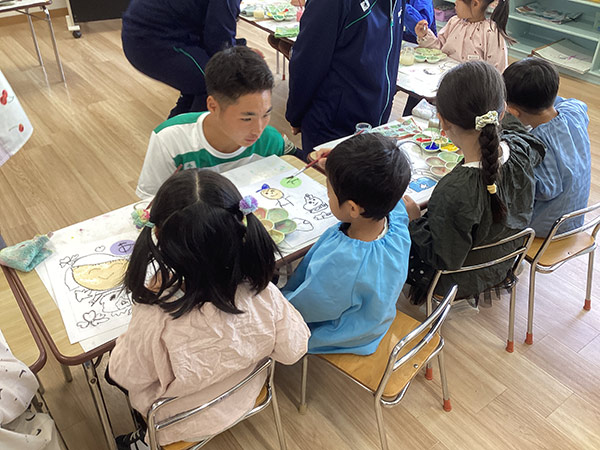 2年生の家庭科の授業の一環として、旭川志峯幼稚園のご協力をいただき体験学習を行ってきました。この取組は、子どもの心身の発育や発達を理解することはもちろん、直接かかわり、一緒にあそぶことを通じて、子どもの生命力や個性を深く理解することを目的としています。幼児と接する生徒の表情には、笑顔と優しさと思いやりがにじみ出ていました。
