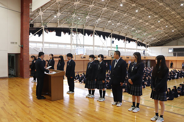 10月1日(水)後期生徒会役員の認証式を行いました。各種生徒会行事を通して、全校生徒が主体性や責任感、協調性を培います。役員の皆さんには、その先頭に立って活躍してくれるものと期待しています。