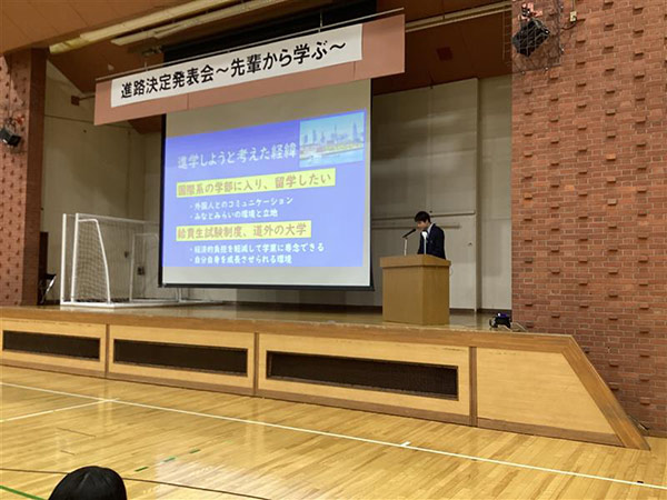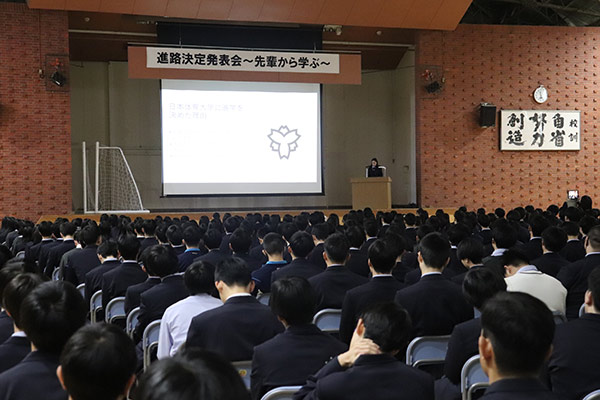 既に進路が内定している3年生の代表が、「進路目標達成までのプロセス」を1,2年生に紹介する進路決定発表会を実施しました。国公立大、難関私大・短大といった進学組から、公務員や民間企業就職に至るまで、自分の夢を実現できる社会へと羽ばたくことになる先輩方から、進路目標実現のためのノウハウを聞きました。