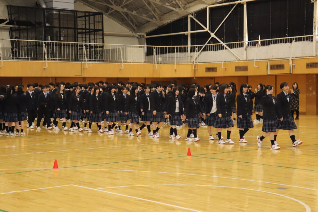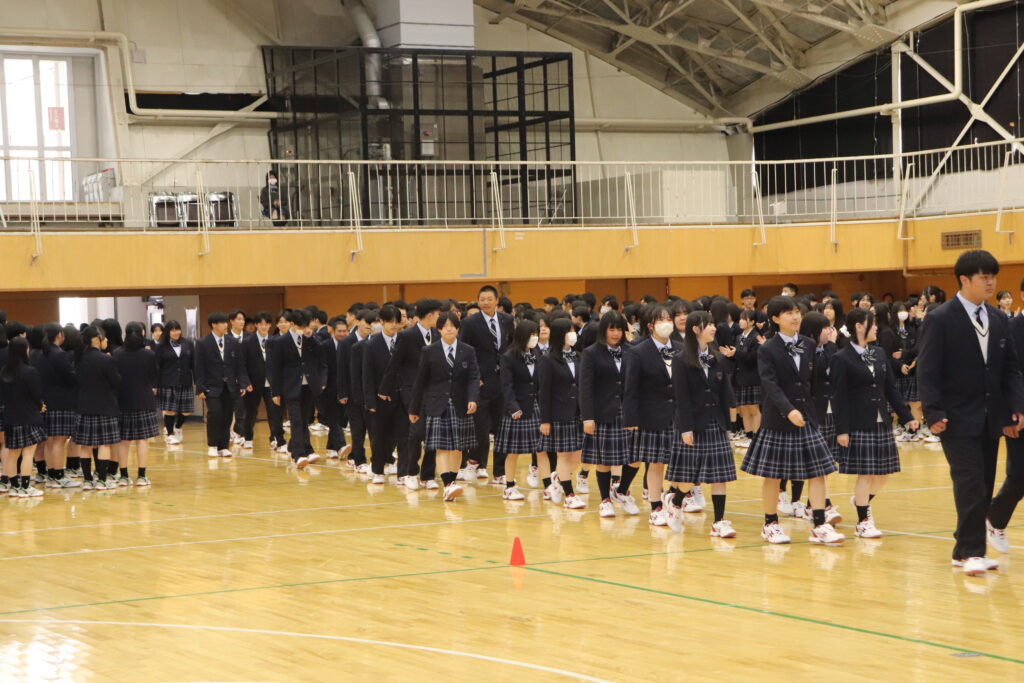 少し緊張した様子で体育館に入ってきた1年生を、2・3年生が拍手で迎えました。