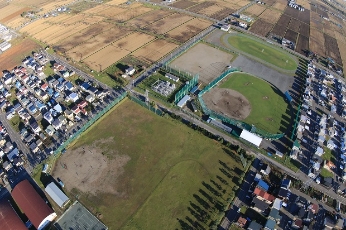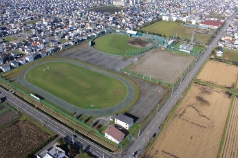 新グラウンド側(手前 陸上トラック 右奥 サッカー場 左奥 硬式野球場 中央奥 軟式野球場)一昔前に比べると随分住宅街が広がりました。